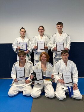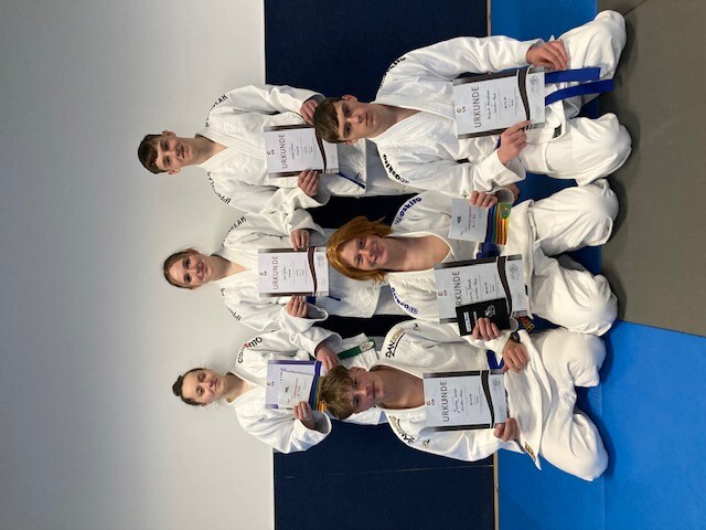 Blaugurt: Melissa Kruczinski vom Senshu-Hau Kleve Braungurt: Joscha Seven, Henrik Meischner und Luca Baum (alle vom Senshu-Hau Kleve), Joshua Wintzen und Joyce Wintzen (vom Judoteam Voerde)