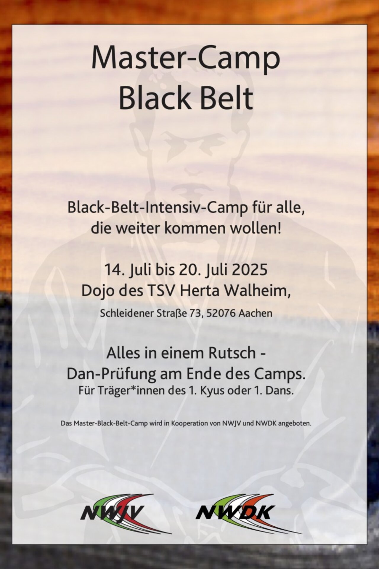 Vom xx. bis zum xx. Juli xx gibt es wieder die Möglichkeit in einem Intensivkurs in Aachen den ersten Dan oder den zweiten Dan zu erwerben.